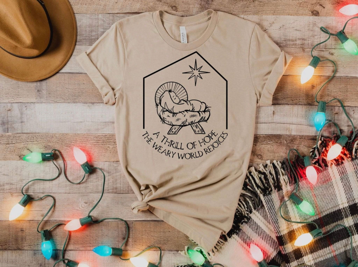This short sleeve tee is printed on natural color tee with black ink, adding a subtle, effortless style that will last for years. The design features an inspirational quote, "A thrill of hope, a weary world rejoices," providing a small pick-me-up for any day. With varying patterns, materials, and colors, this timeless, sophisticated look can be tailored to any style.