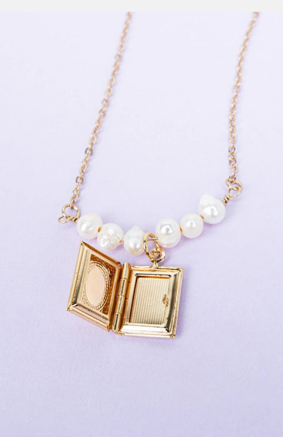 AN OPEN BOOK GOLDTONE & PEARL LOCKET NECKLACE