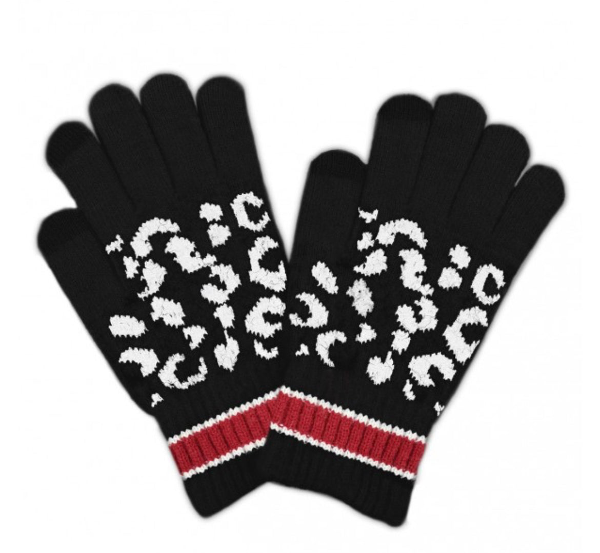Black Knit Leopard Print Smart Touch Gloves With Stripe