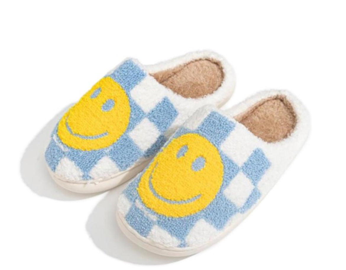 Introducing our blue happy face slippers, the perfect combination of comfort and festive cheer! Made of 100% polyester with a soft plush feel, these 'plush happy face slip on slippers are available in two US women's sizes: S/M (6-8) and M/L (8-10). With a durable rubber sole, these slippers are perfect for lounging around the house or keeping your feet warm during the holiday season. Order yours today and spread the holiday spirit!