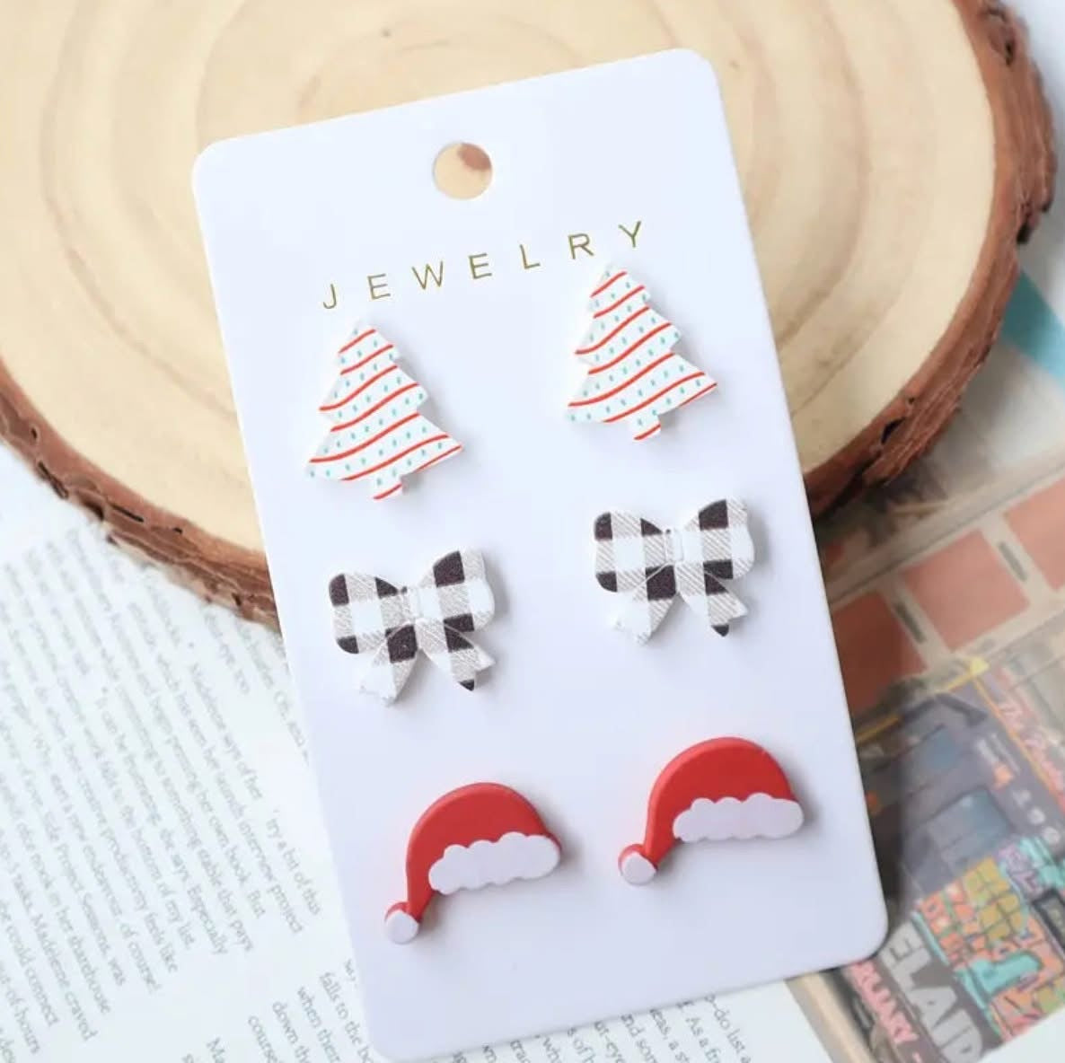 Introducing our Bows + Trees Holiday Earrings Studs Set! With 3 pairs per card, this set features lightweight, acrylic earrings in festive designs. Complete your holiday ensemble with these stylish and comfortable accessories.