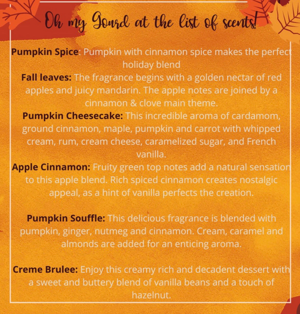Fall Leaves-Golden fragrance of red apples & juicy mandarin. The apple notes are joined by cinnamon & clove main theme.