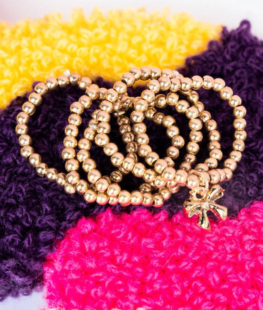 Enhance your style with this sparkling ring set! Featuring 5 individual strands of goldtone with 3mm beads, stretch band, and a charming bow charm. This set measures .75" in diameter, is lead and cadmium compliant, providing you with a stylish and safe accessory option.