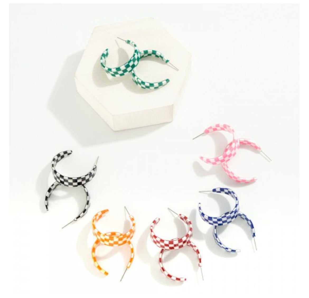Introducing our Checkered Acetate Tapered Hoop Earrings, available in green, blue, or red. Made from durable acetate, these earrings feature a chic checkered design. Elevate any outfit with a touch of color and style. Perfect for any fashion-forward individual.