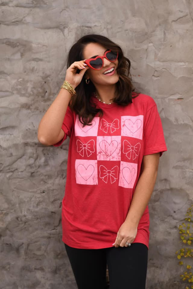 Step into style with our Checkered Bows & Hearts Tee! This must-have top features a playful pattern of checkered bows and hearts, adding a touch of whimsy to any outfit. Perfect for those who love a fun and quirky look, this tee is sure to turn heads and put a smile on your face.