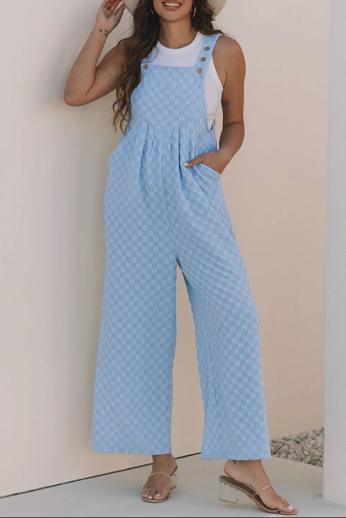 Stay cool and stylish this summer with our chic sleeveless jumpsuit. Made from 95% polyester and 5% elastane, it's lightweight and perfect for daily wear. The trendy checkered pattern and functional bib pocket detail add a fashionable touch to this casual style. Check out our size chart for the perfect fit.