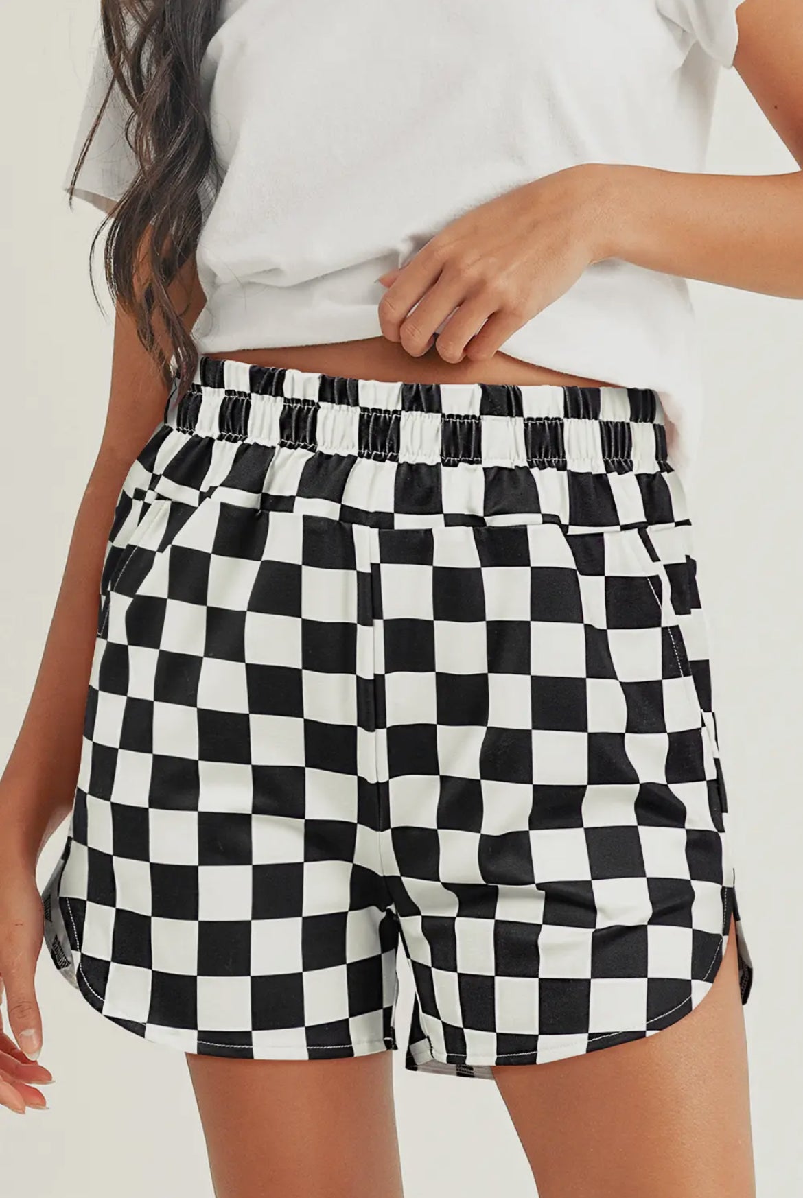 Elevate your look with these Checkered Print High Waisted Shorts! The trendy checkered pattern makes a statement, while the elastic waist provides all-day comfort. Perfect for game day or everyday wear. Made with 95% poly and 5% elastane for a flattering fit.