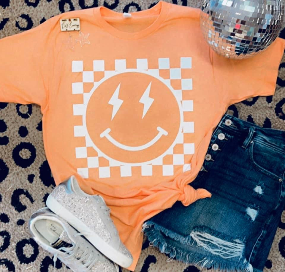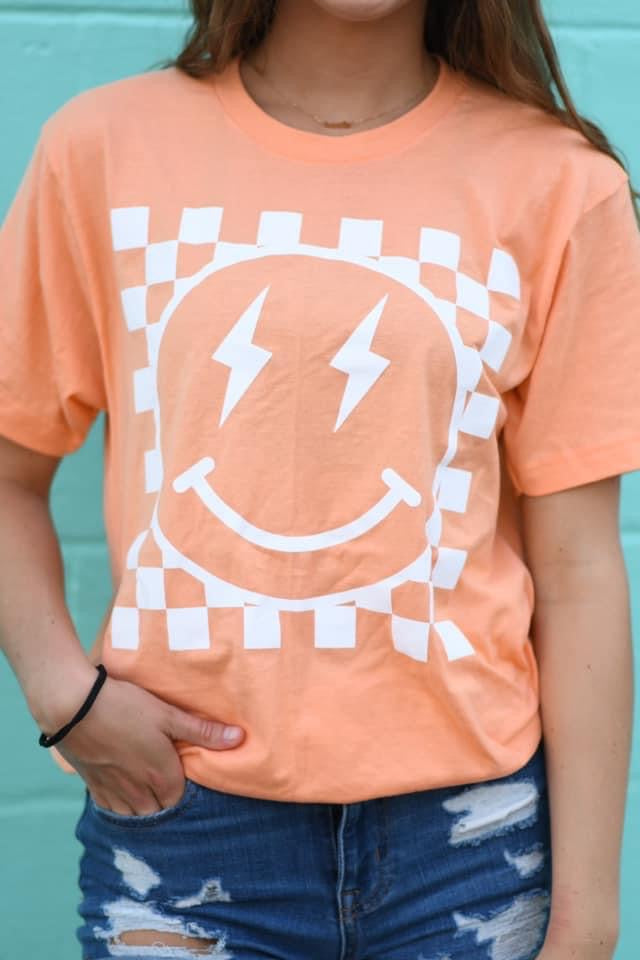 Stand out in the crowd with this checkered smiley lightning bolt graphic tee. With its tangerine color, this cotton blend is sure to be a zappy addition to any wardrobe. Plus, the materials may have natural variations and colors may vary from screen to screen, adding a unique flair to this already eye-catching design. So, don't be square, and be sure to size up for that oversized look!
