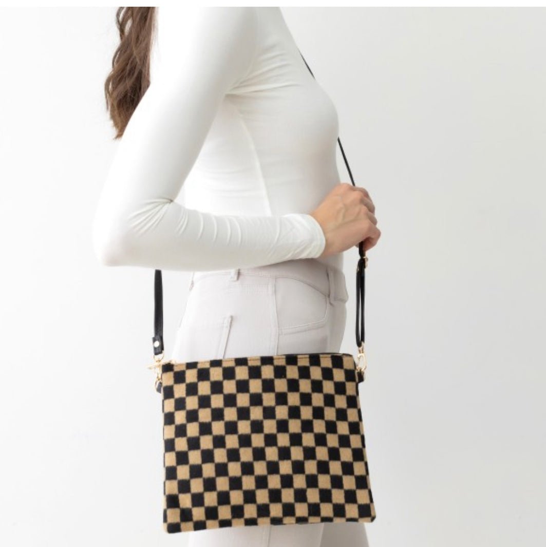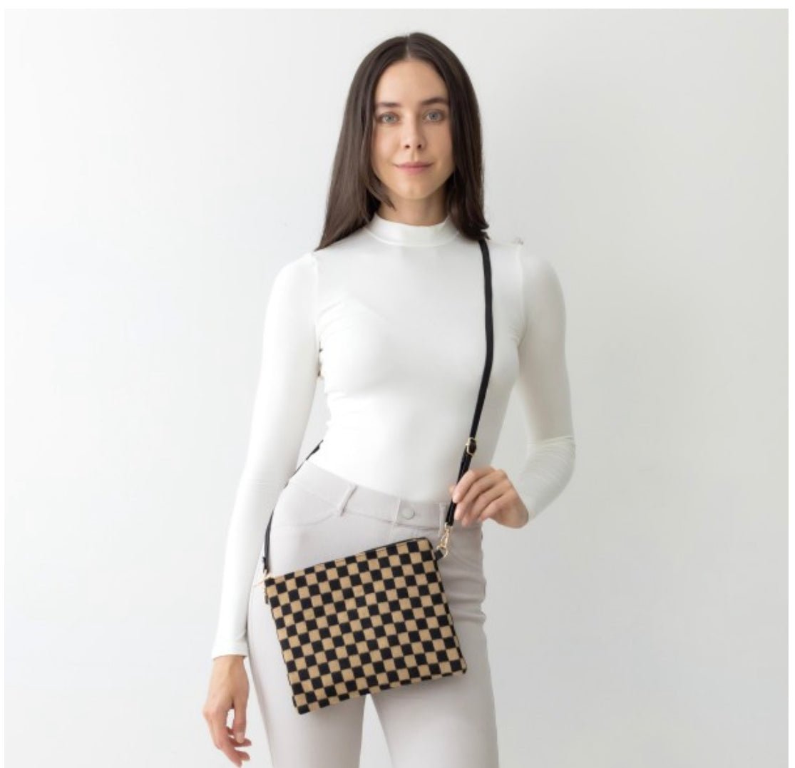 Checkered Cross Body Handbag With Detachable Leather Wristlet and Adjustable Strap.