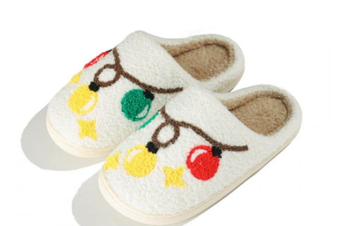Introducing our Christmas lights slide on slippers, the perfect combination of comfort and festive cheer! Made of 100% polyester with a soft plush feel, these 'plush happy face slip on slippers are available in two US women's sizes: S/M (6-8). With a durable rubber sole, these slippers are perfect for lounging around the house or keeping your feet warm during the holiday season. Order yours today and spread the holiday spirit!