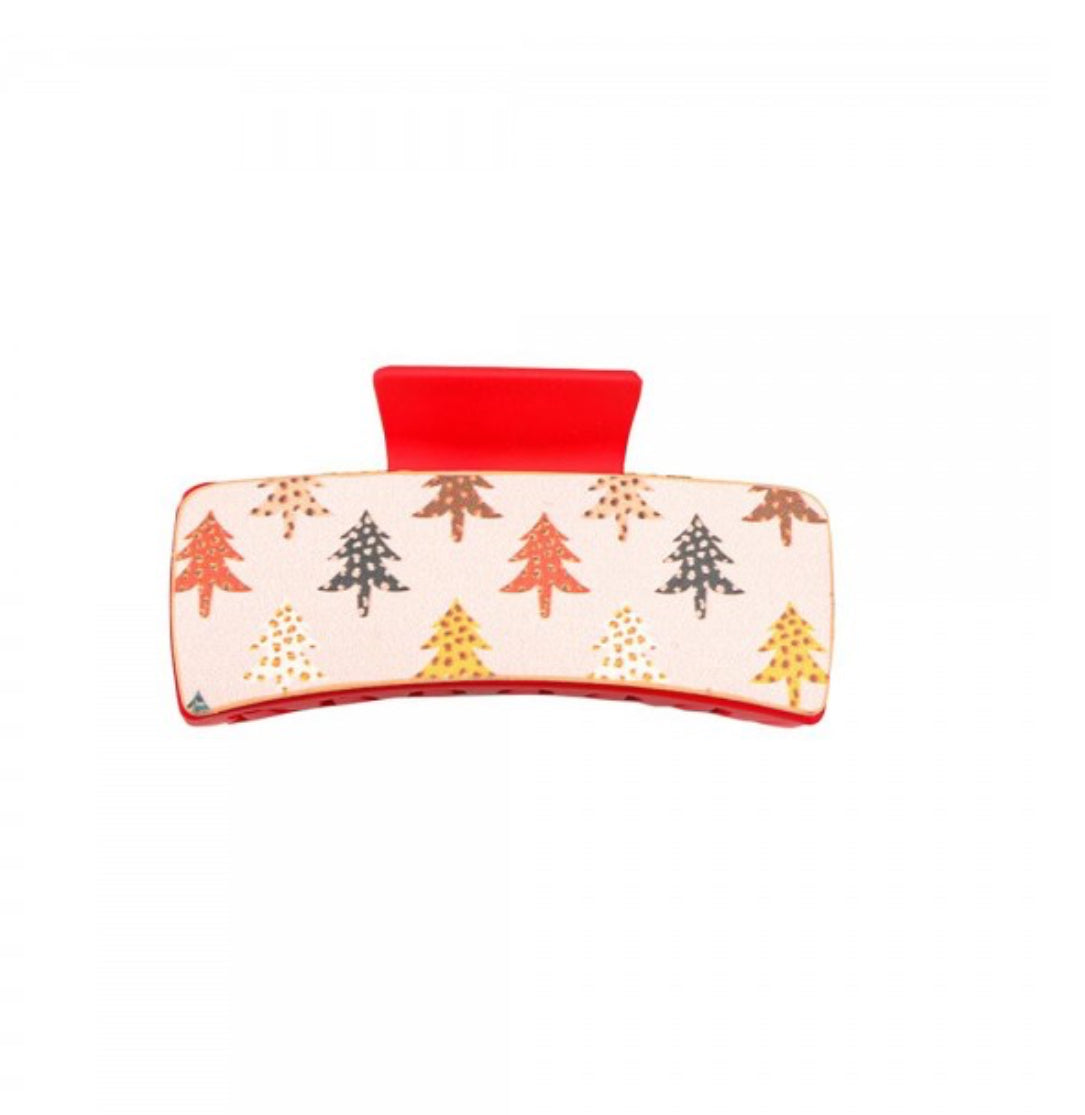 This matte hair claw clip features a festive Christmas tree print detail, made with vegan leather. Its sturdy grip and 4" length provide effortless styling for any hair type. Embrace the holiday spirit while keeping your hair in place.