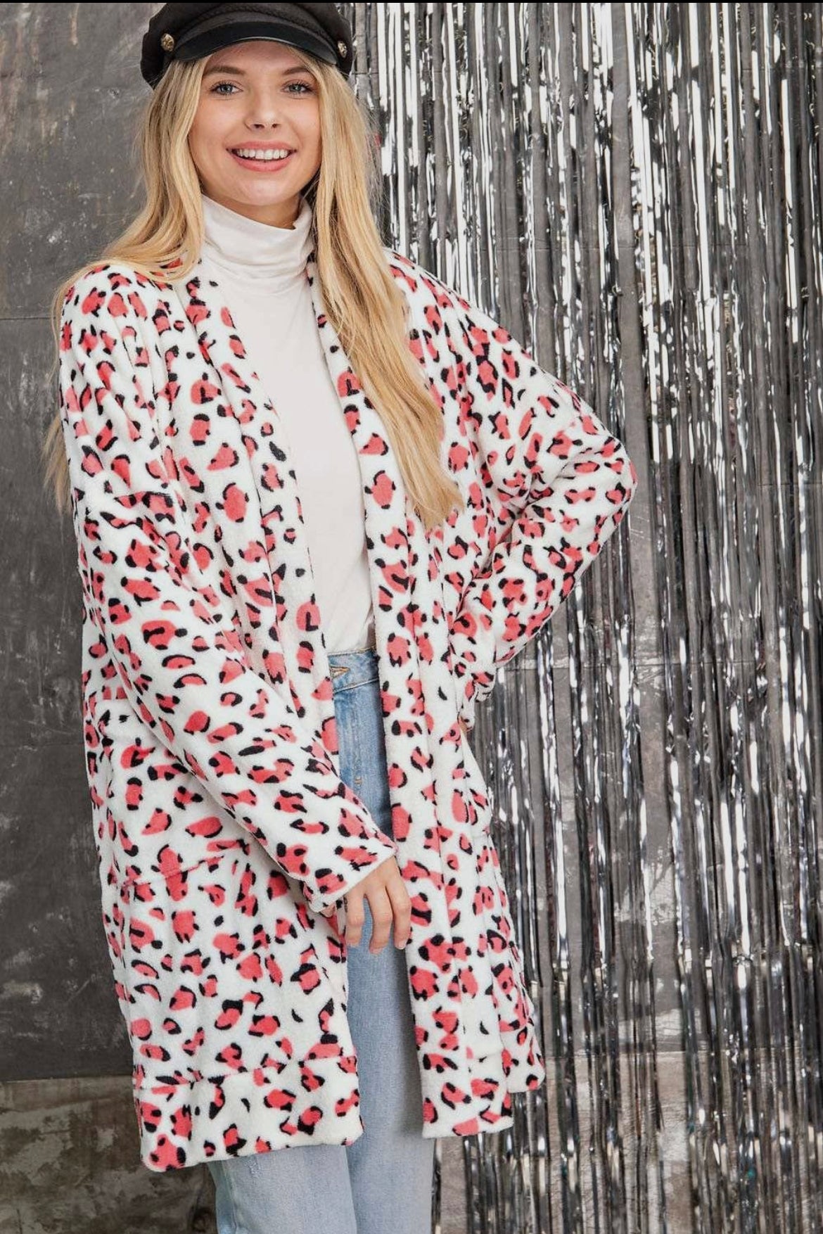 This Coral Leopard Print Cardigan is perfect for an evening out. Crafted from soft double-side leopard print fleece, it has a flattering long sleeve design and pockets to conveniently store your belongings. A stylish way to stay warm and make a statement.
