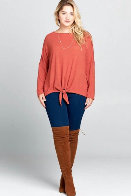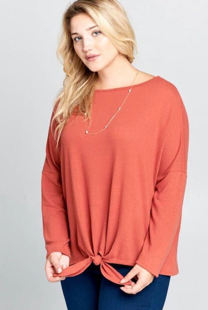 Fall into this front knot top. Solid hacci brush long sleeve front knot casual top in mauve.
