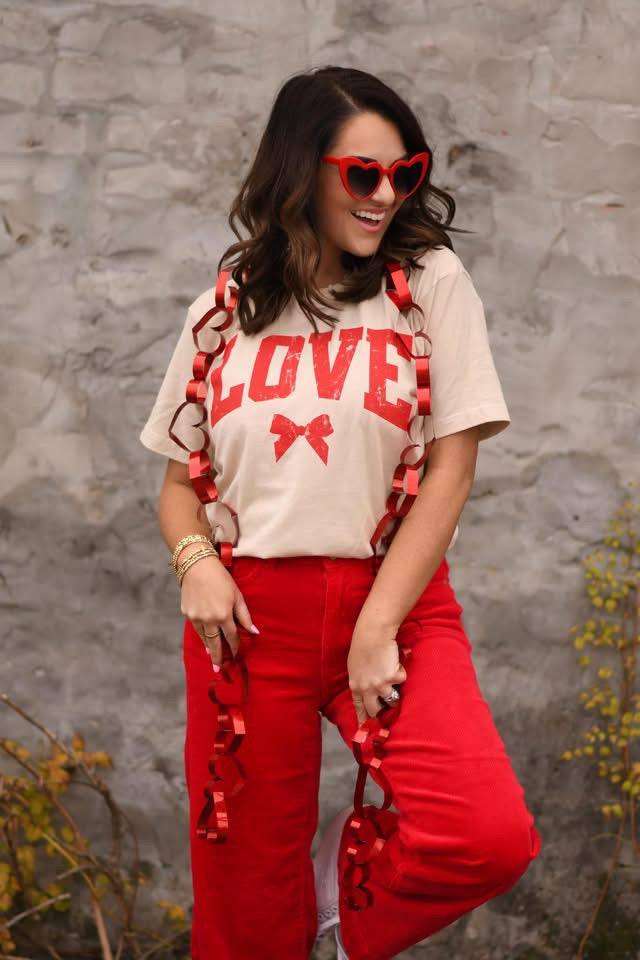 Unleash your bold side with our Distressed Love Bow tee! Featuring a unique bow design and distressed detailing, this tee is perfect for those who love to take risks. Make a statement and take on any challenge in style.