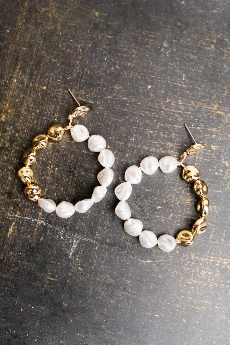 Achieve a classic look with the DOUBLE DATE PEARL EARRINGS. These goldtone hoops feature a hammered texture and faux baroque pearls for a timeless touch. The stud with beaded loop design adds an elegant flair, while the 2" post earrings are lead and cadmium compliant. Elevate any outfit with this versatile and stylish accessory.
