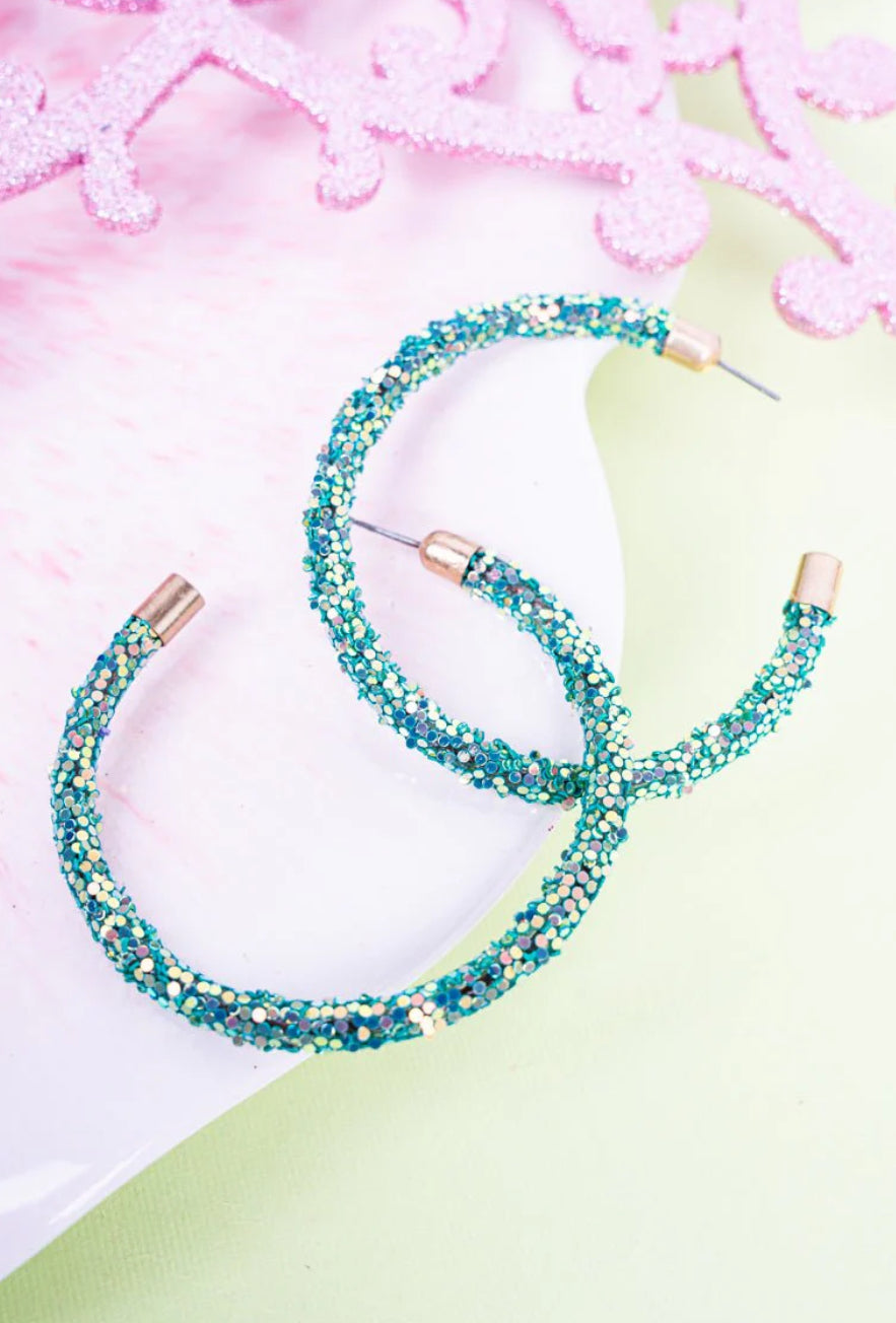 These Emerald Glitter Hoop Earrings are a must-have for any special occasion. The dazzling emerald tone and glitter accents add the perfect touch of sparkle to your look. At 2.25" in diameter, these post-style earrings are both stylish and comfortable. Plus, they are lead and cadmium compliant, making them a safe and beautiful choice.