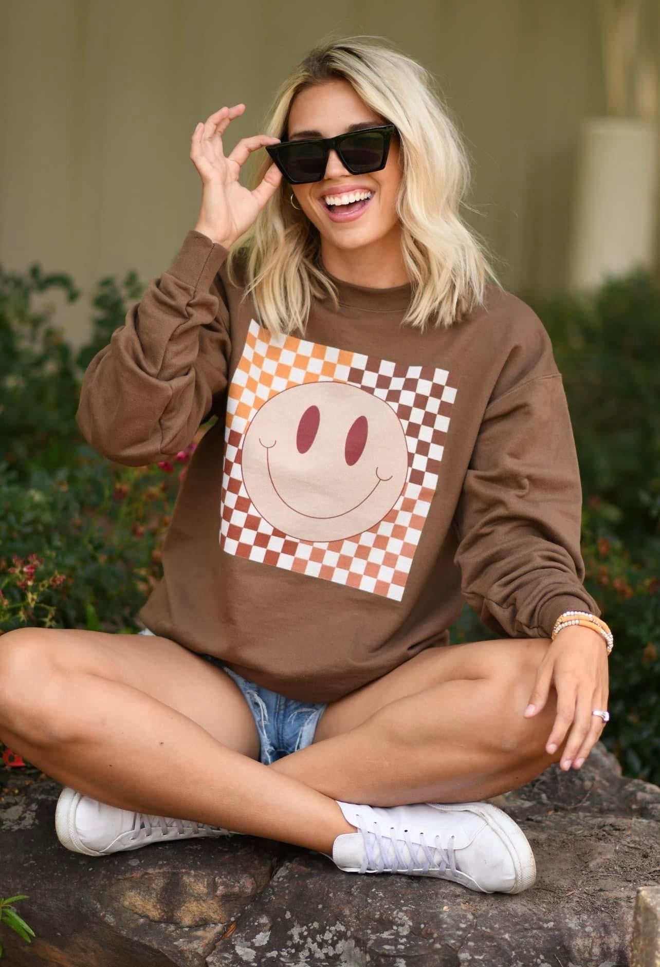The Fall Checkered Smile Sweatshirt is a stylish wardrobe addition featuring an iconic smiley print on a brown checkered background. Upgrade your wardrobe with this best-selling design now available in the comfort of a sweatshirt fabric.
