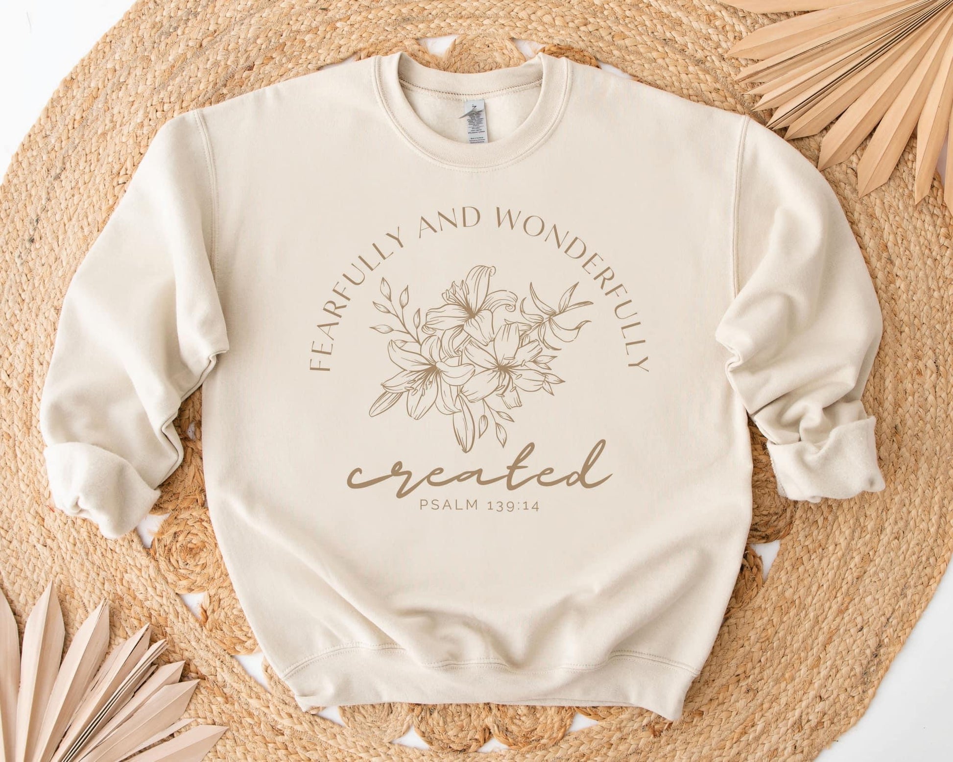 Show off your unique style and faith with our Fearfully and Wonderfully Created sweatshirt. Made with a tan base and dark tan ink, this sweatshirt is a reminder that you are fearfully and wonderfully made. Embrace your individuality and showcase your beliefs with this comfortable and expressive piece.