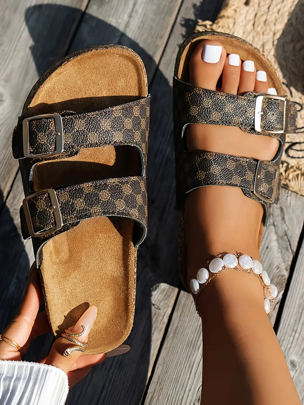 Upgrade your shoe game with these Geometric Print Buckle Sandals. Made from high-quality PU leather, these flat slippers feature a stylish geometric print and cut-out design for a trendy and breathable look. The buckle decor adds an extra touch of aesthetic appeal. Perfect for daily wear in any season.