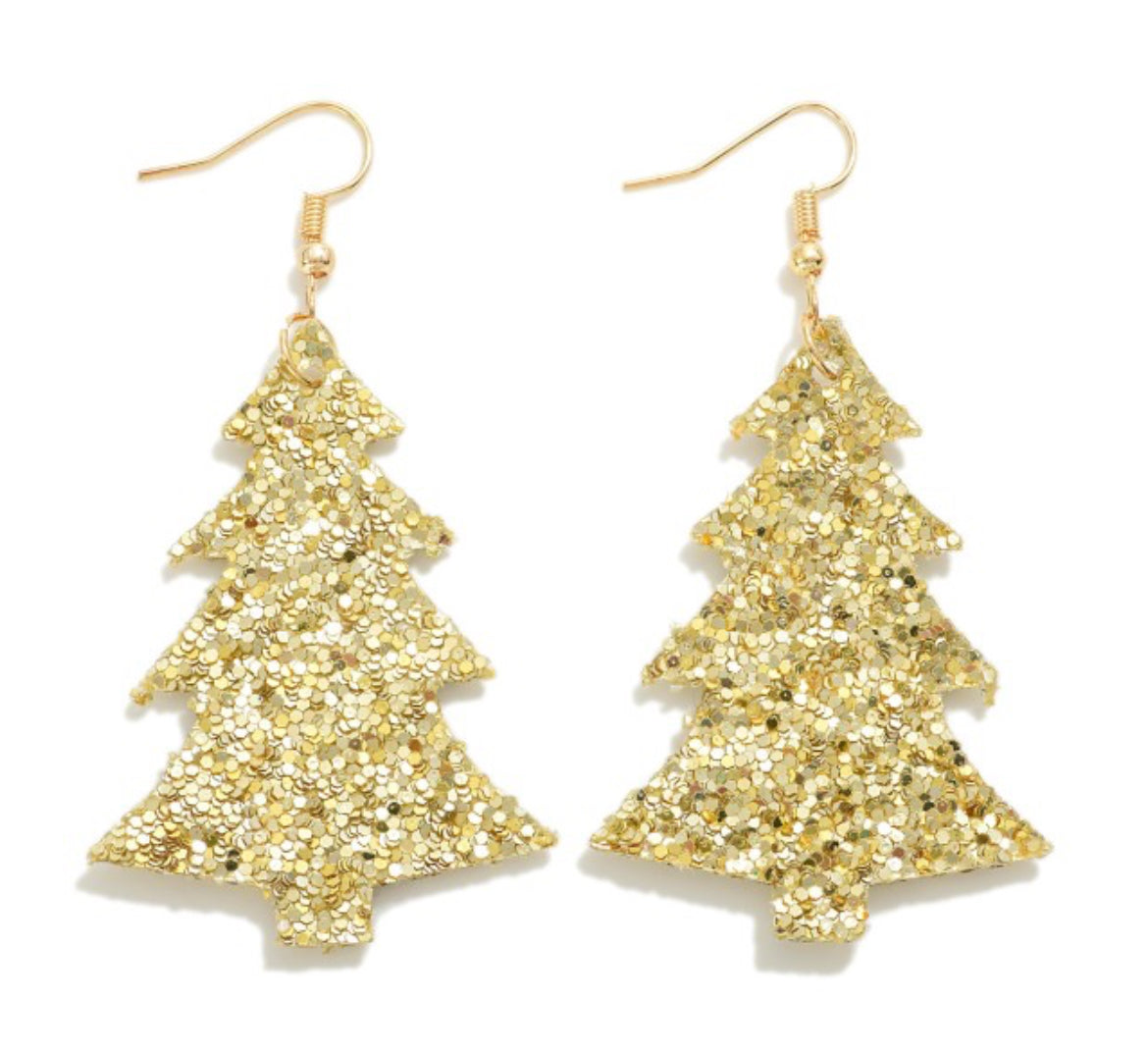 "Add a touch of festive sparkle to your holiday outfit with our Gold Glitter Christmas Tree Earrings. Expertly crafted with shimmering glitter and designed in a whimsical Christmas tree shape, these drop earrings measure approximately 2.5" in length. Elevate your seasonal style with these elegant and eye-catching earrings."