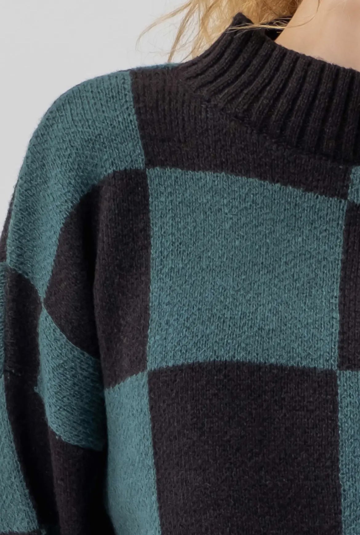 Expertly crafted with 100% polyester, this Hunter green & black checkered sweater boasts a high crew neck and long sleeves for ultimate comfort. Keep warm and stylish with this versatile knit piece.