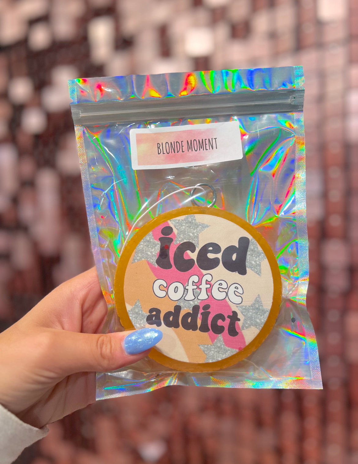 Introducing our Iced Coffee Car Freshie, perfect for the coffee lover on the go. The refreshing scent of sweet bubble gum and citrusy orange, with hints of floral jasmine and powdery baby powder. Keep your car smelling delicious and clean with our blonde moment fragrance..