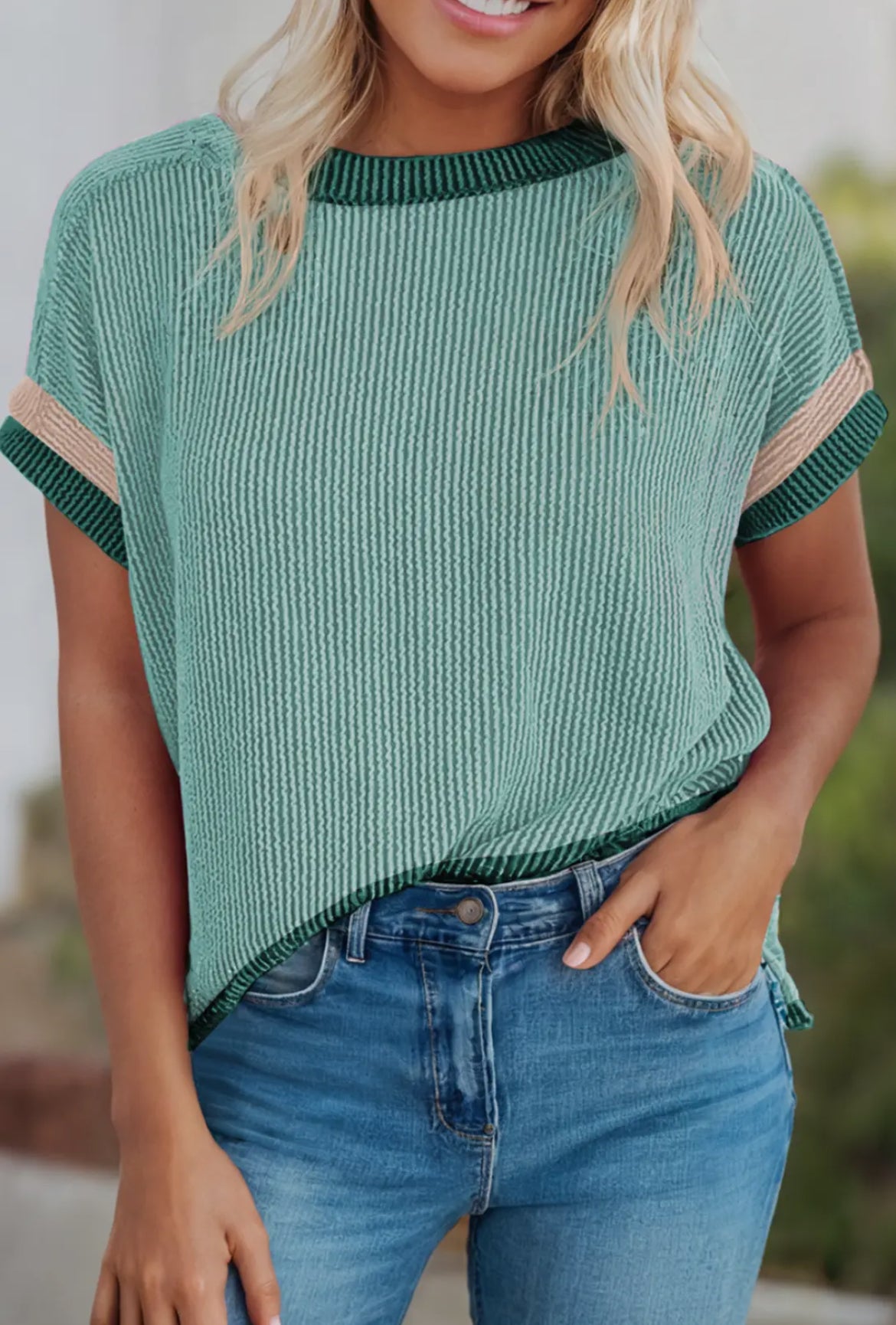 Introduce the latest addition to your summer wardrobe with our Jump Right in Grass Green Color Block Top. Made from a textured fabric that is both unique and stylish, it features a contrast trim detail that catches the eye. Pair it with your favorite denim shorts for an effortlessly chic look. Material: 75% polyester, 20% viscose, 5% elastane. Pattern: Color Block. Color: Grass Green.