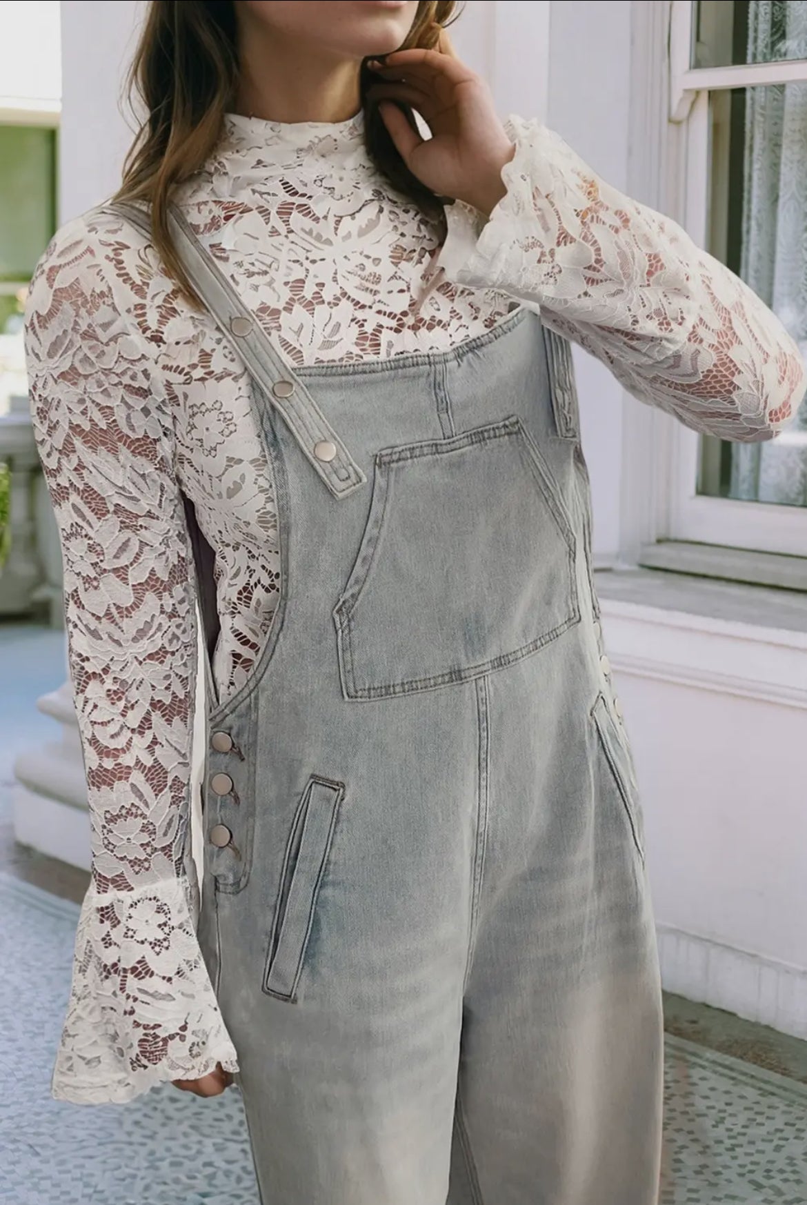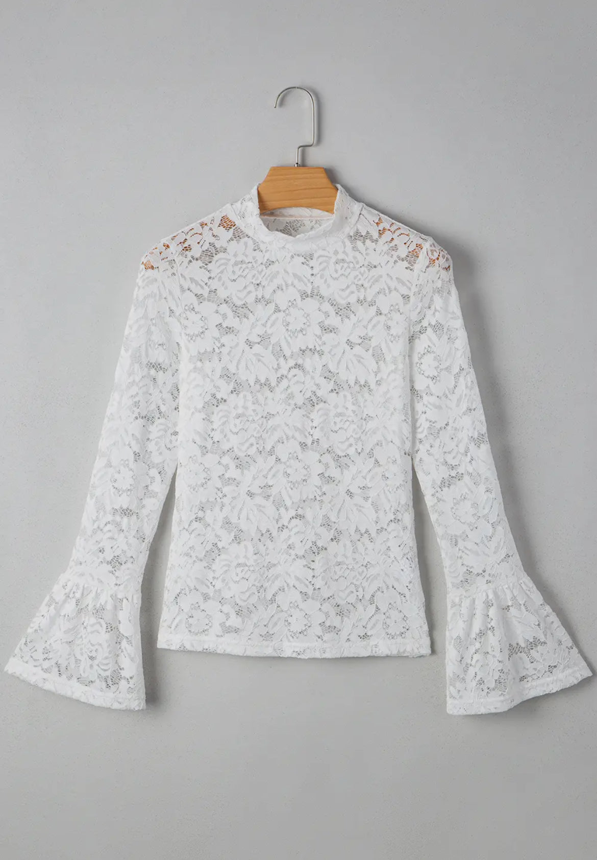 This elegant lace crochet top exudes sophistication with its refined design. The trendy bell sleeves add a stylish flair, while the mock neck creates a modern silhouette. Made with 90% polyamide and 10% elastane, it offers both comfort and style.