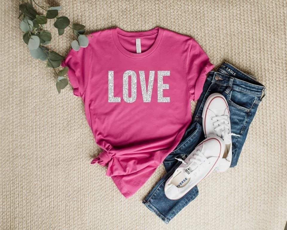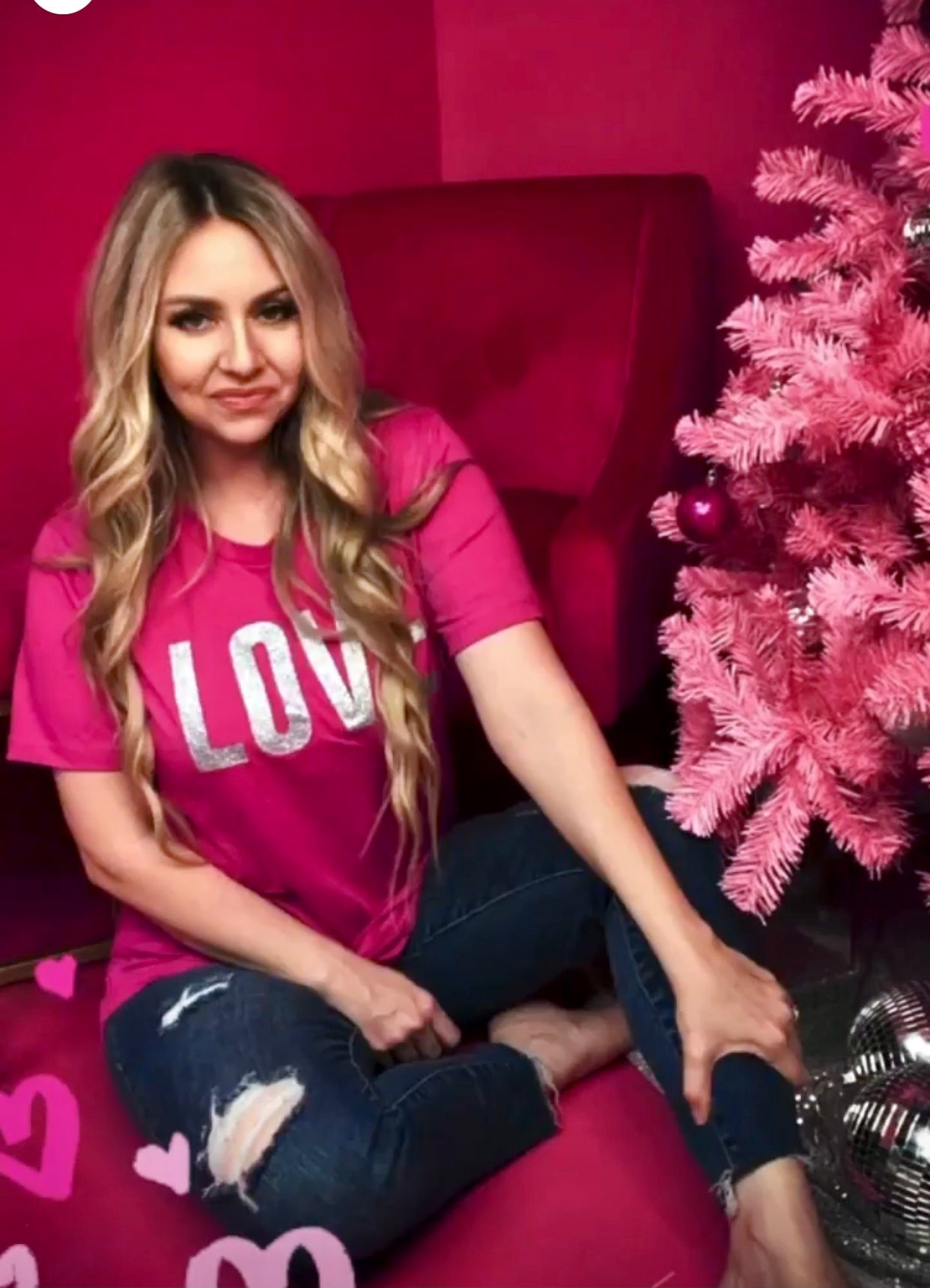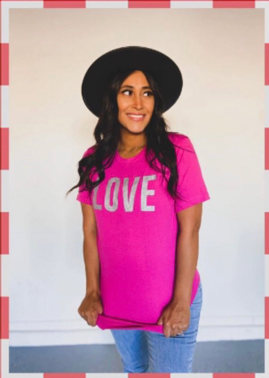 This sweet graphic tee is so perfect for Valentine's Day or any day you want to show a little extra love! Featuring a gorgeous berry pink color paired with the silver ink, this statement tee is sure to stand out on the crowd! The material is lightweight and soft - it's so comfortable to wear! You can easily layer this look with a cozy cardigan or jacket in the spring! Or wear it with jeggings and sandals in the summer!