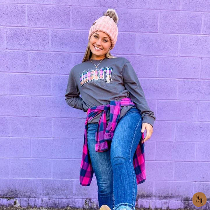 We're feelin' very merry in this bright plaid design, it certainly puts us in the Christmas spirit. Perfect for layering up and wearing your funnest Christmas accessories.