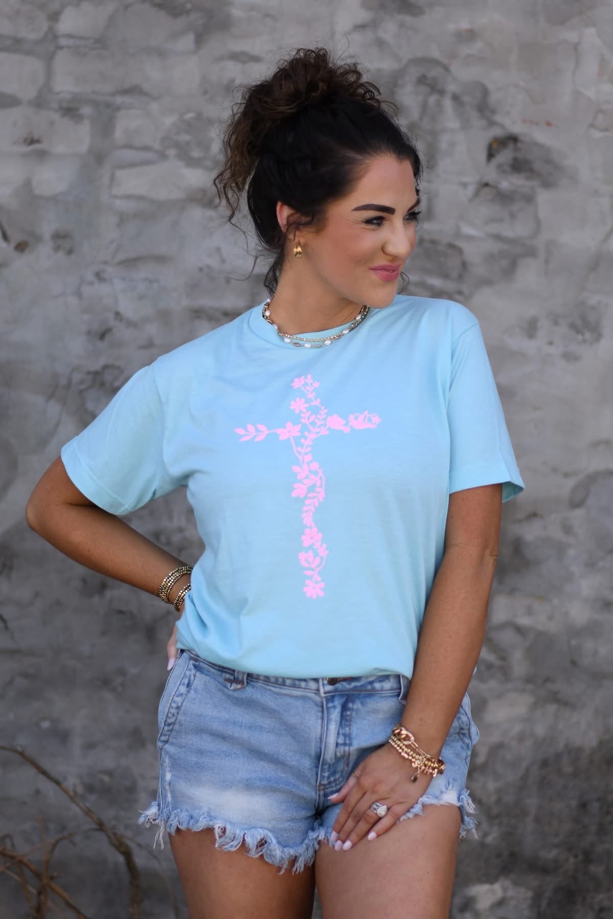 Introducing our Neon Pink Floral Cross Tee, featuring a vibrant neon pink floral cross on a soft purist blue tee. Made with comfort and style in mind, this tee is perfect for adding a pop of color to any outfit. Embrace your unique style with this eye-catching design.