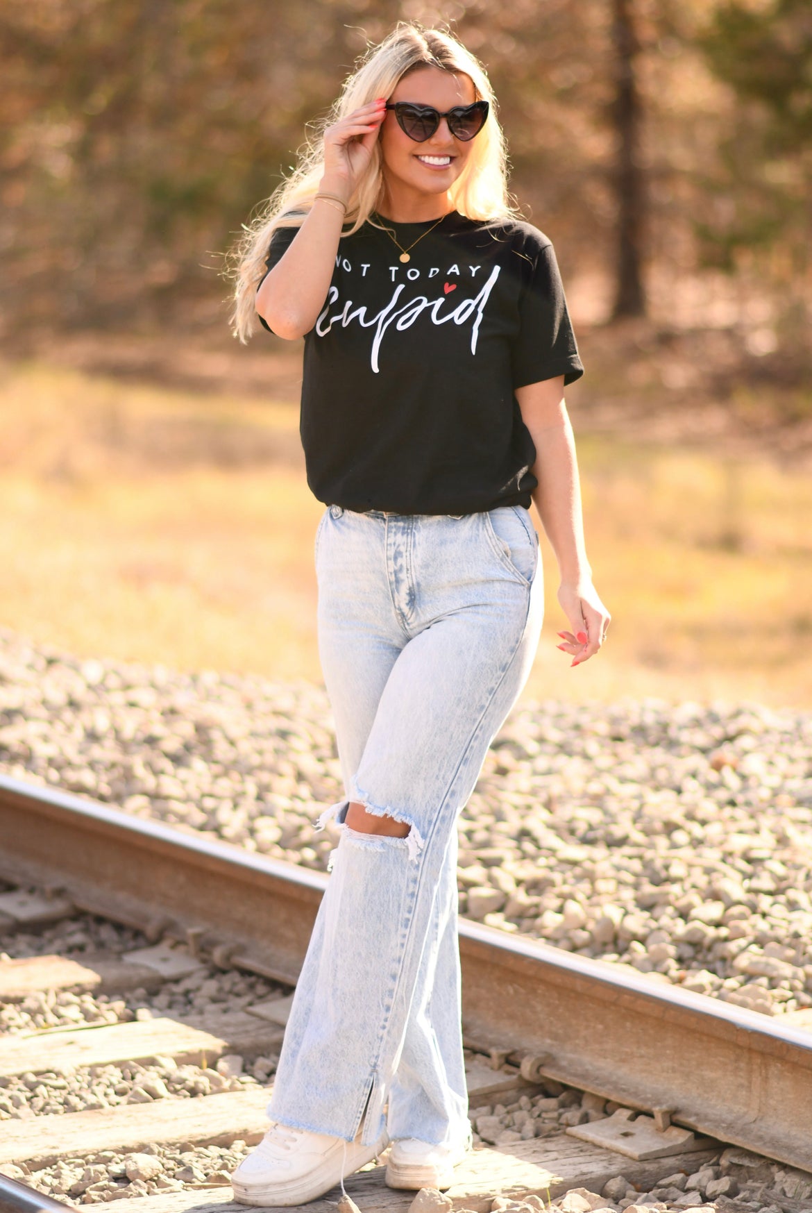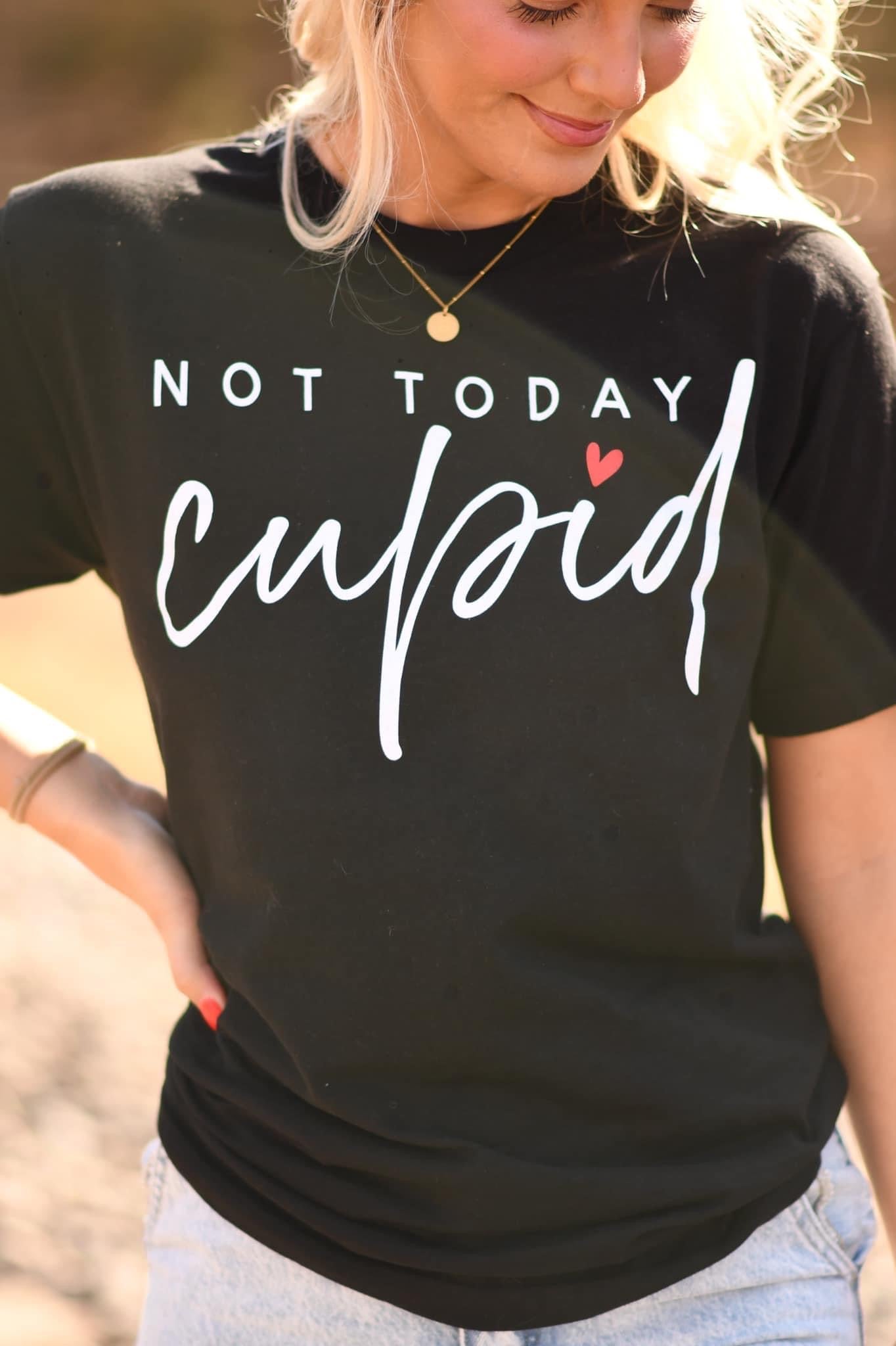 Introducing the Not Today Cupid Tee - the ultimate arrow-dodging shirt. Take a stance against Cupid and his shenanigans with this soft black tee. Stay stylish and rebellious with this bold statement piece.