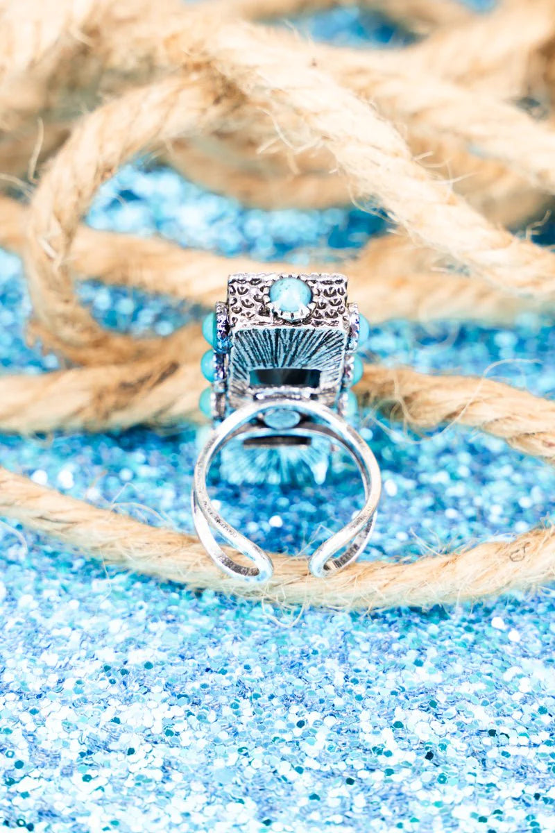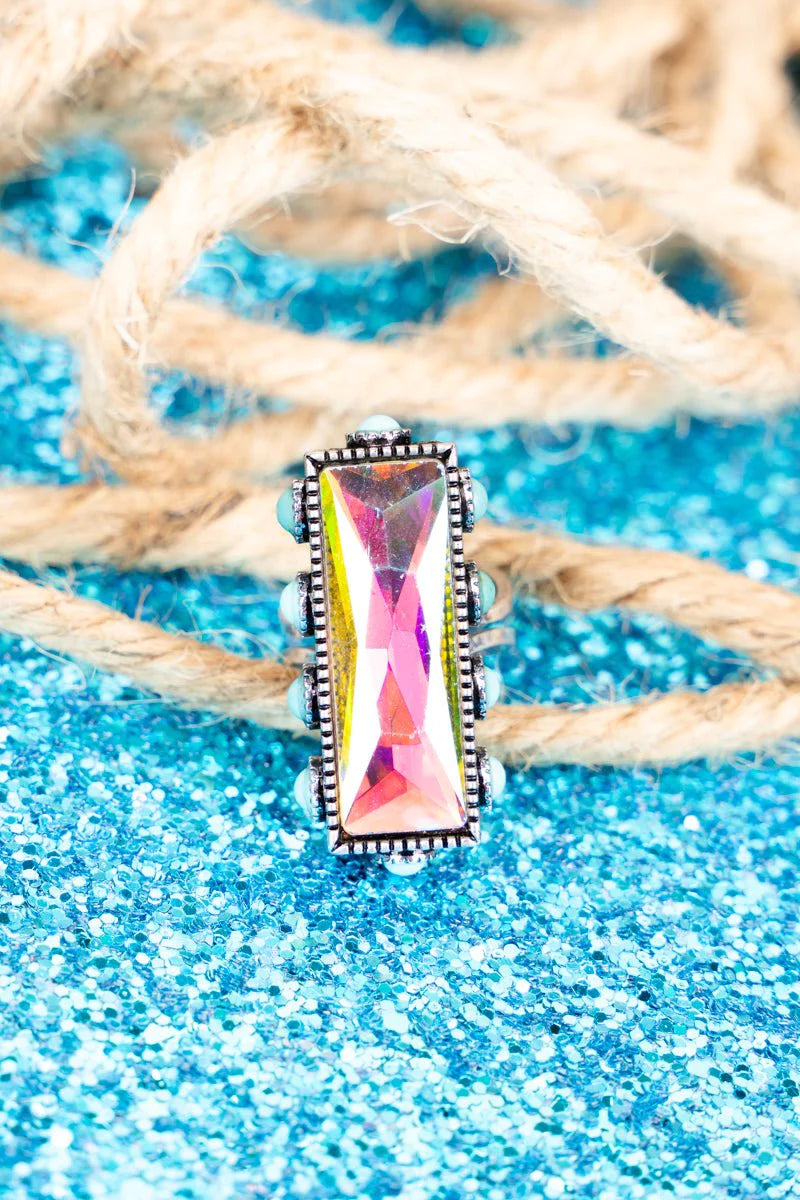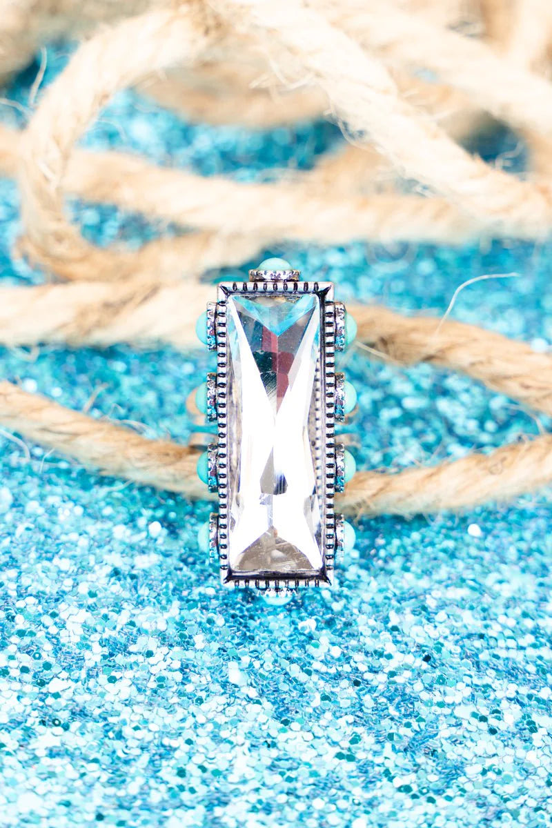 This elegant ring is the perfect way to add western flair to any outfit. It is burnished with a silvertone finish and features a large faceted rectangular or bar shaped stone as the centerpiece. The edges of the ring are detailed with faux round stone beads and a textured accent cuff band. It is Lead & Nickel compliant and available in two colors, making it the perfect accessory to any look.