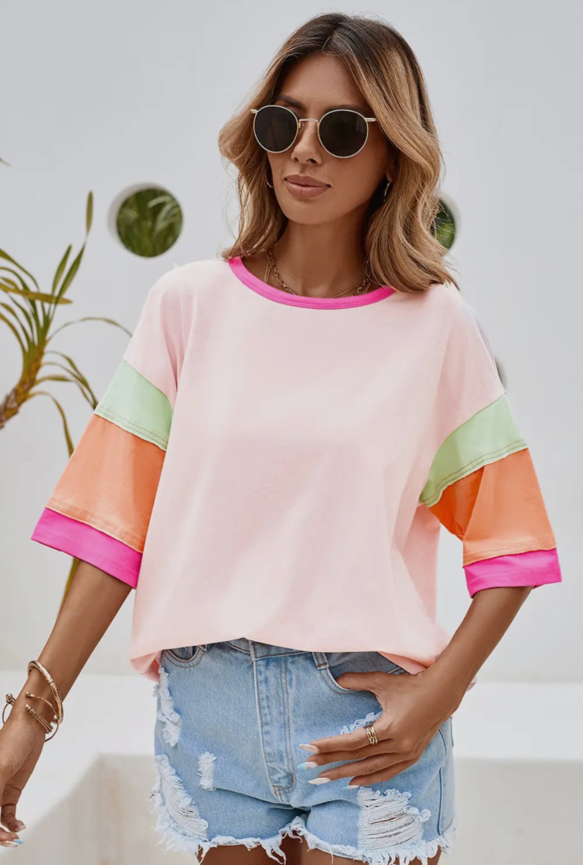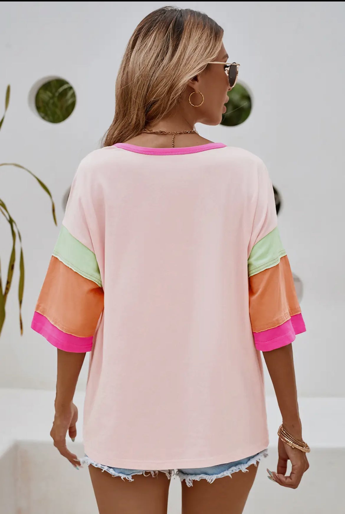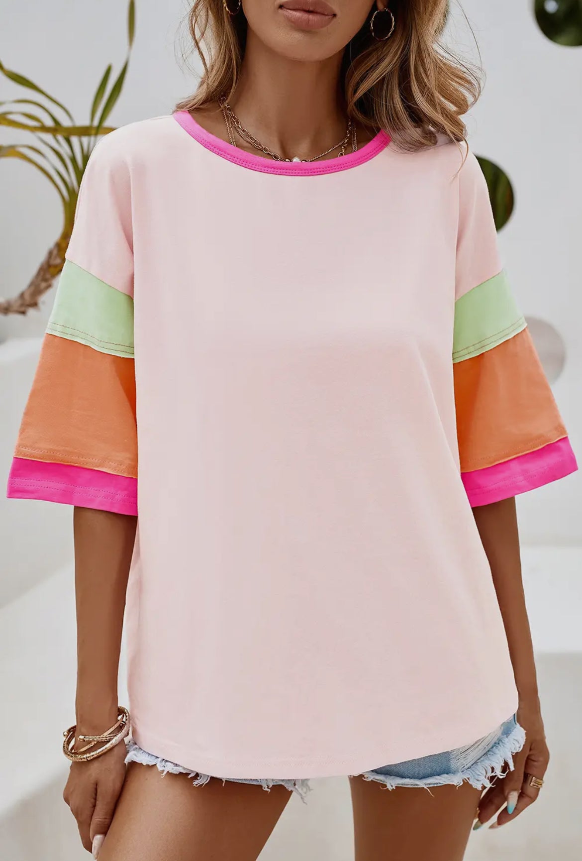 PINK COLOR BLOCK STITCHING SLEEVE ROUND NECK OVERSIZE TOP