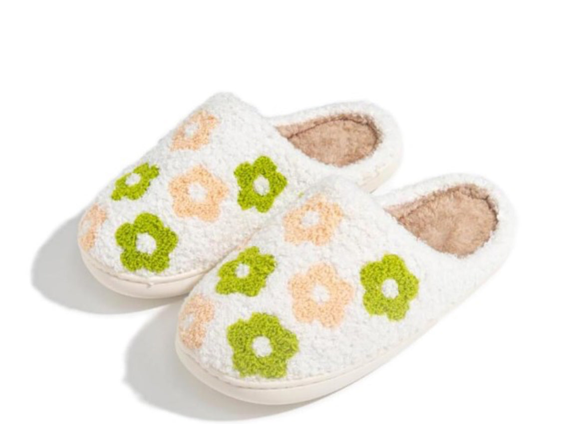 Plush Flowers Slide On Slippers-Green