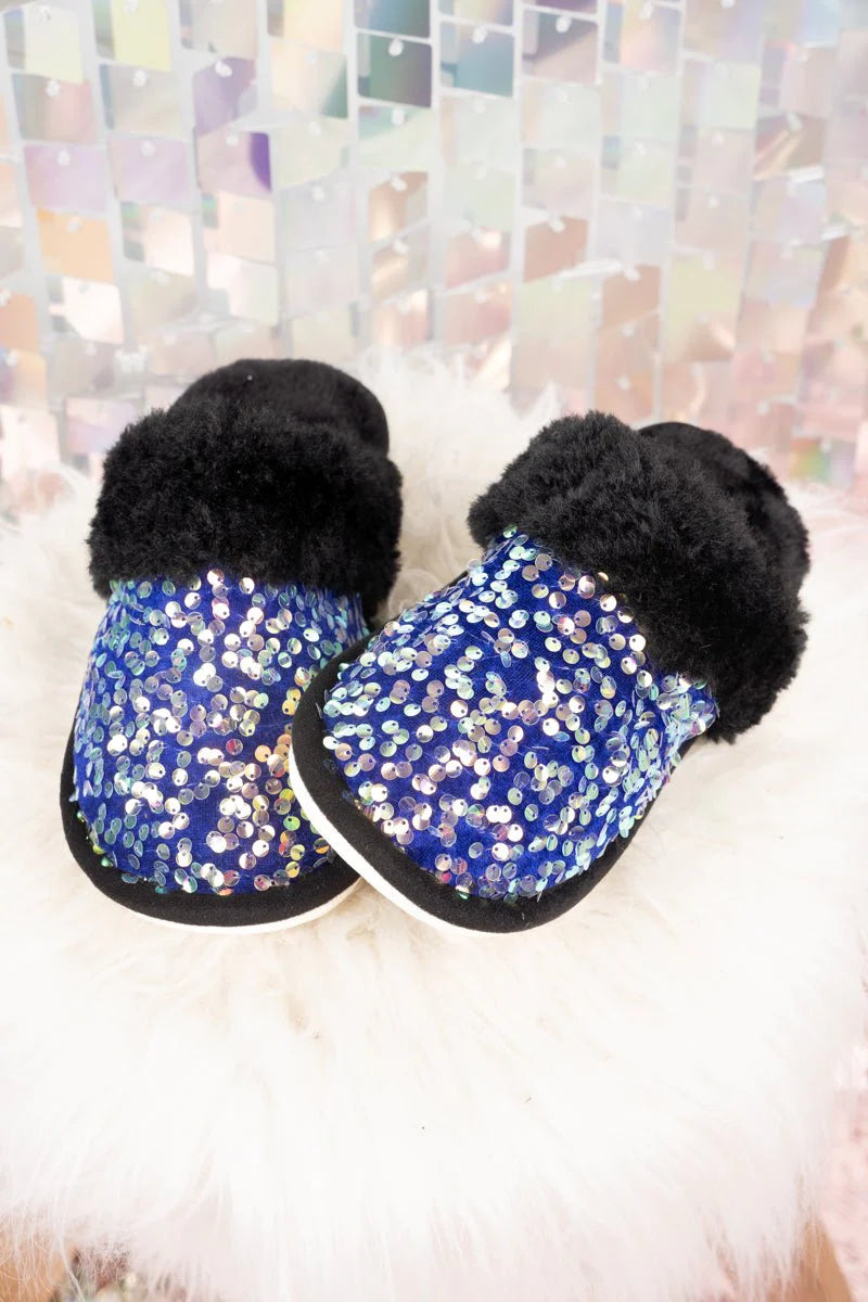 Slip into comfort with these adorable slippers featuring plush material patterned with sparkly sequins! Size 7.5-8