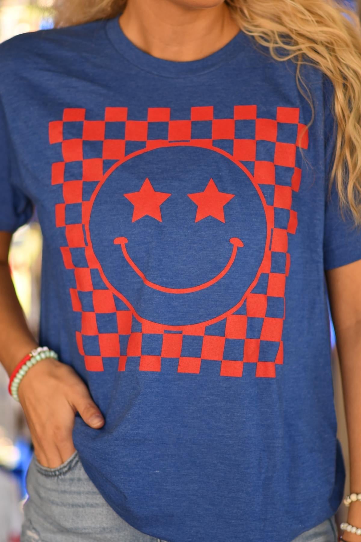 This Smiley Star Check Tee is a fun addition to any wardrobe. Made of soft heather royal blue fabric, the tee features a playful smiley check design in bold red ink. Perfect for adding a pop of color to your outfit while still maintaining a classic and casual look.