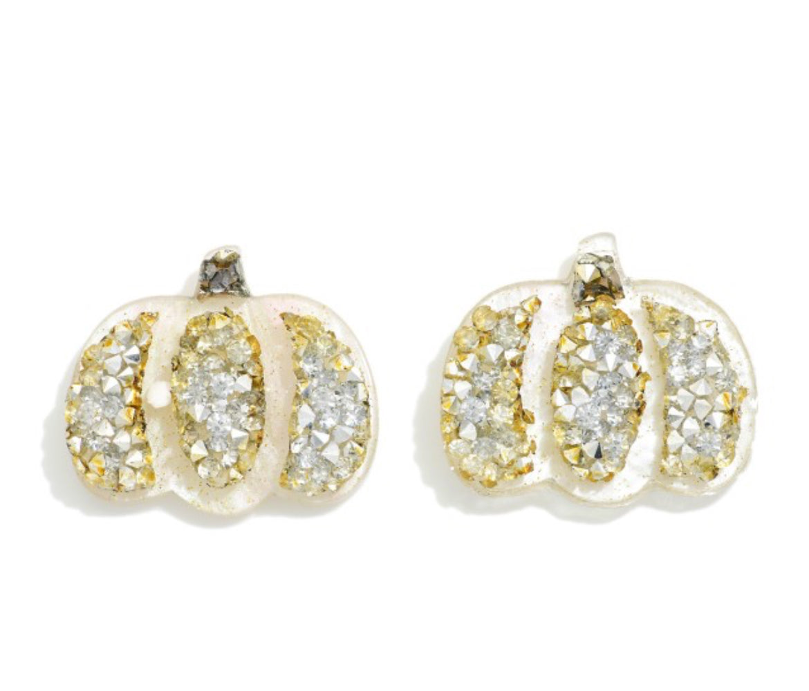 Enhance your fall wardrobe with these Glitter Acetate Pumpkin Stud Earrings. Measuring approximately .75" in length, these stylish earrings add a touch of sparkle to your outfit. Made of durable and lightweight materials, these earrings are perfect for pumpkin patch adventures or a night out. Upgrade your accessory game now!