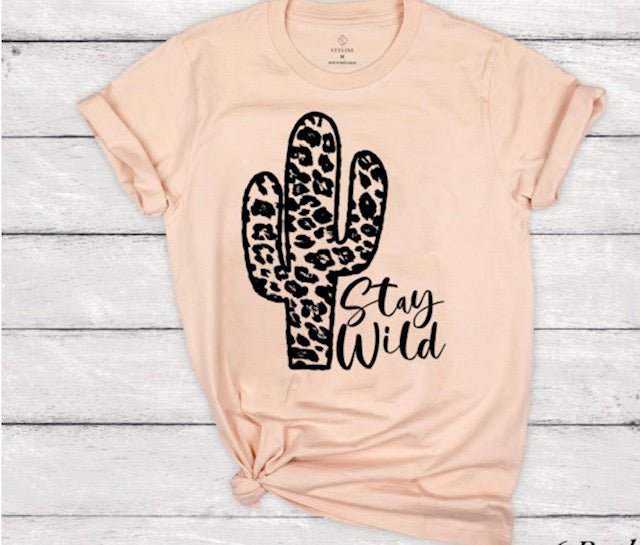Stay wild and stylish in our "Stay Wild" Tee. Made with a soft blush colored fabric, this tee features a unique leopard print cactus design. Stand out in style and comfort with this trendy tee.