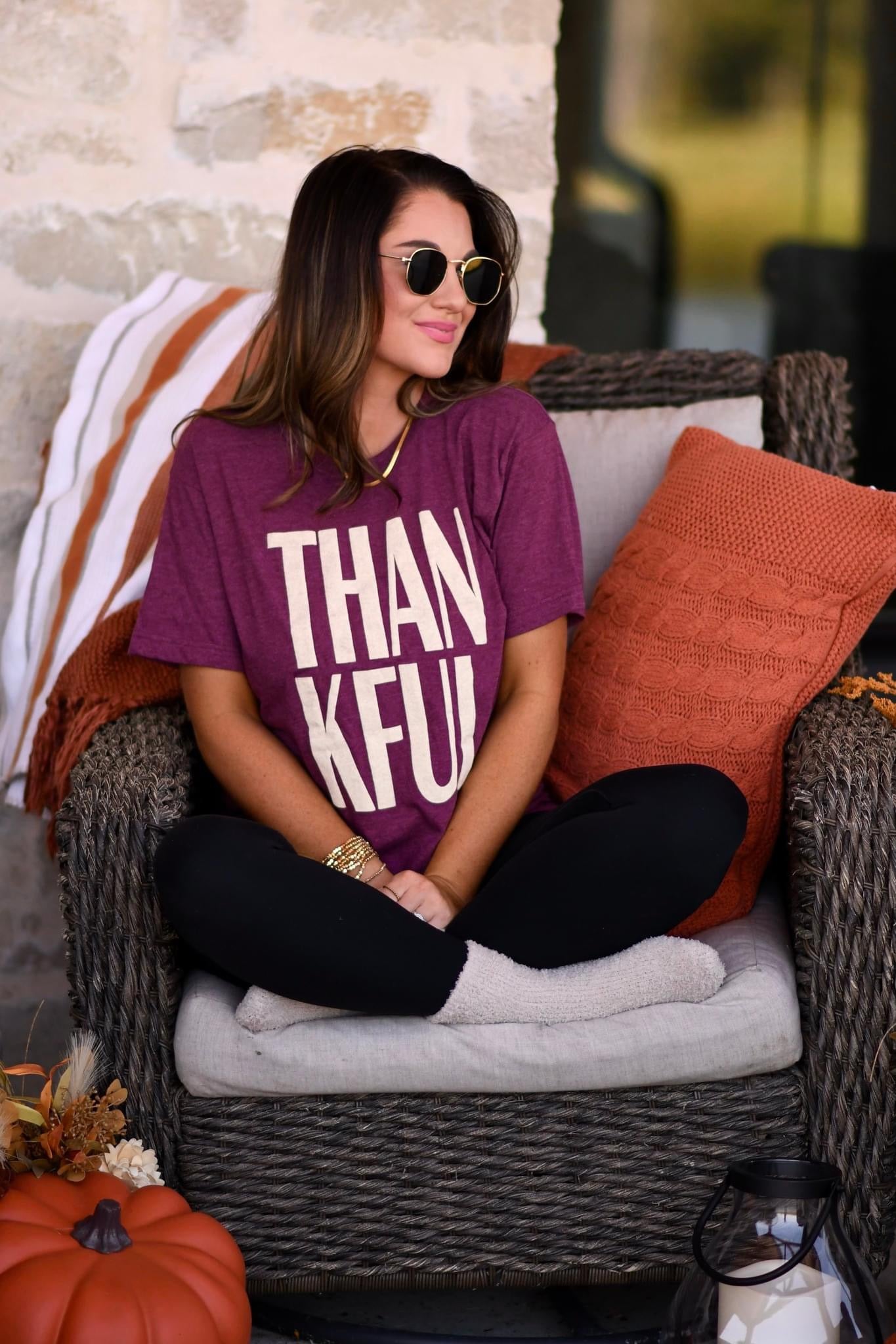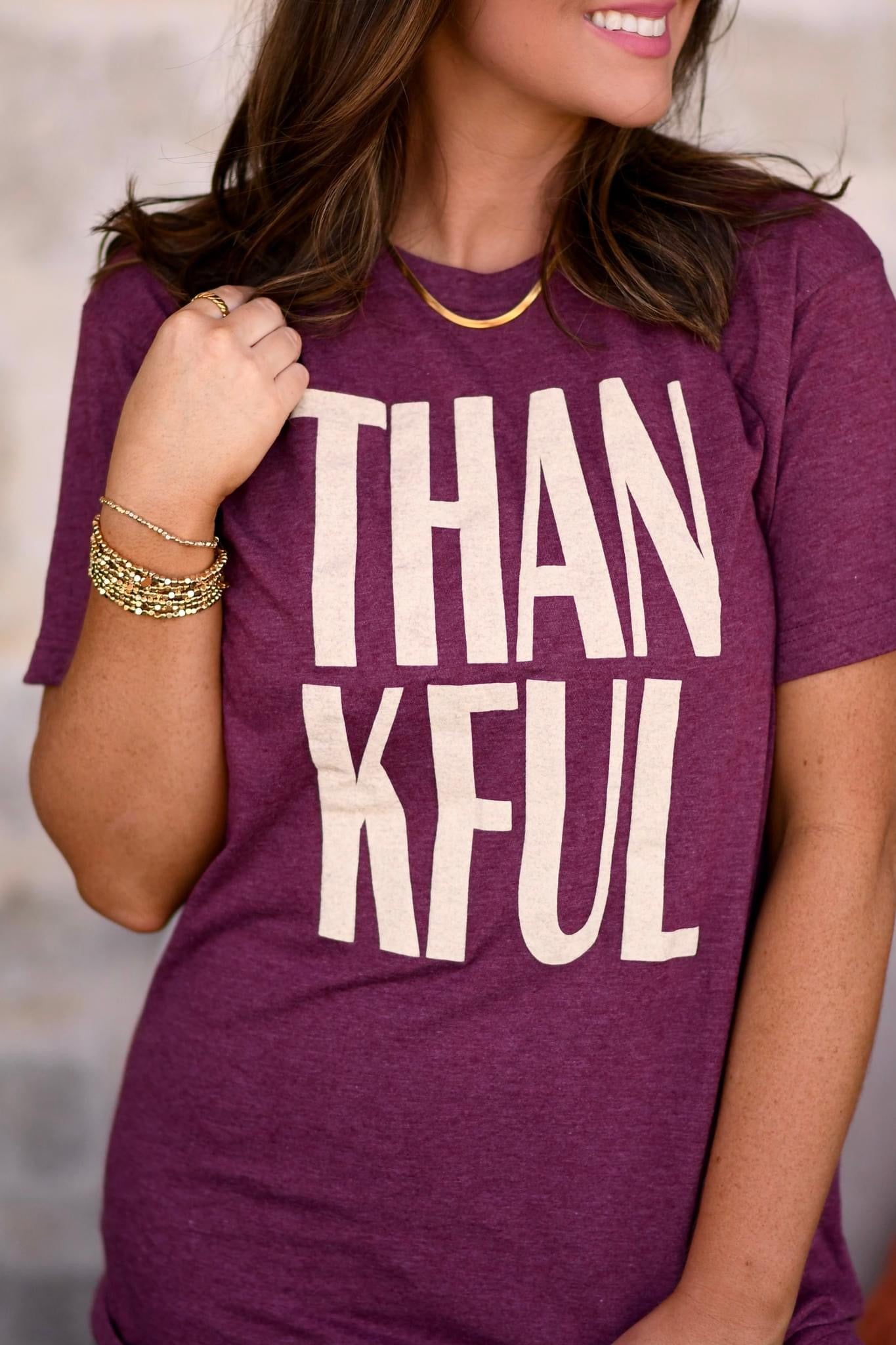 This Thankful Tee is perfect for adding a touch of gratitude to your wardrobe. Made with a soft and comfortable heather maroon material, this tee features a unique puff ink design. The puff ink adds texture and dimension to the shirt, making it stand out from the rest. Show your appreciation in style with this Thankful Tee.