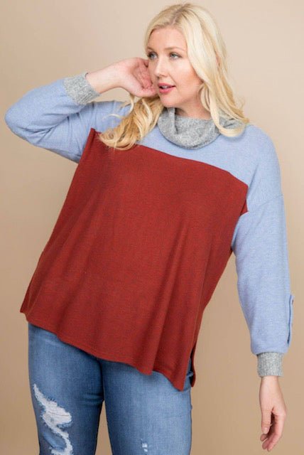 Curvy size color block hacci brush casual pullover with cowl neck, button sleeve detail & side slit, rust/blue.