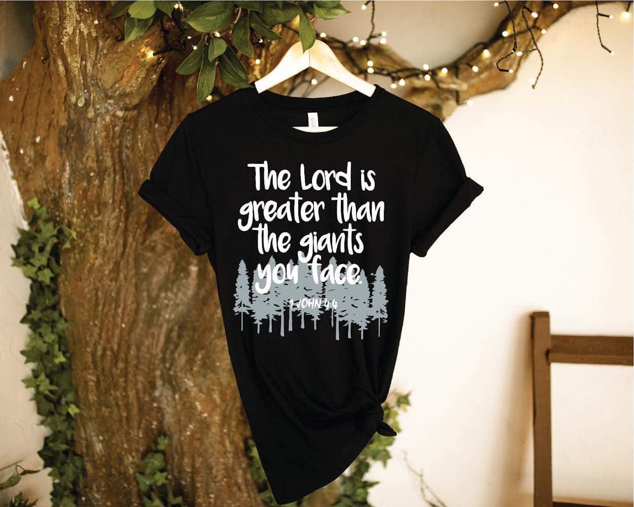 What a great reminder to keep our giants at bay by focusing our our great God. Simple black tee with white and grey ink. Soft and comfortable. Great to wear to church on Sunday or out running errands.