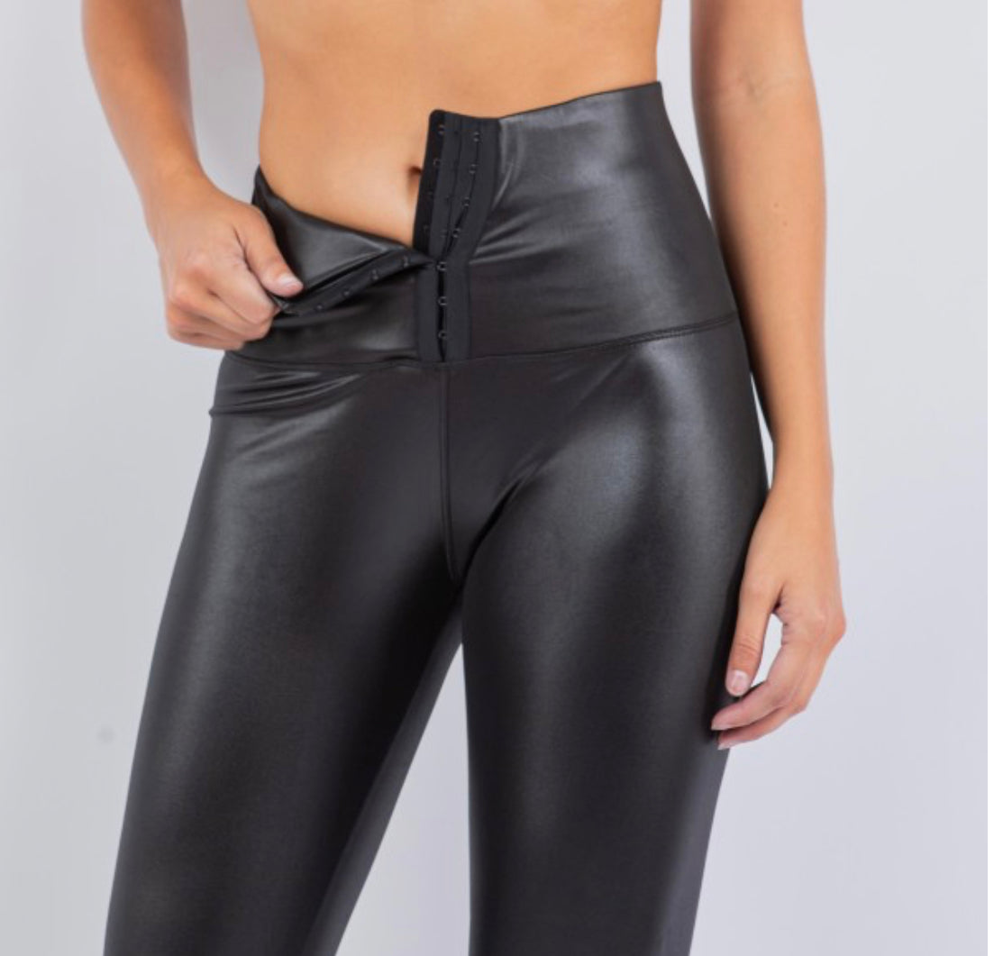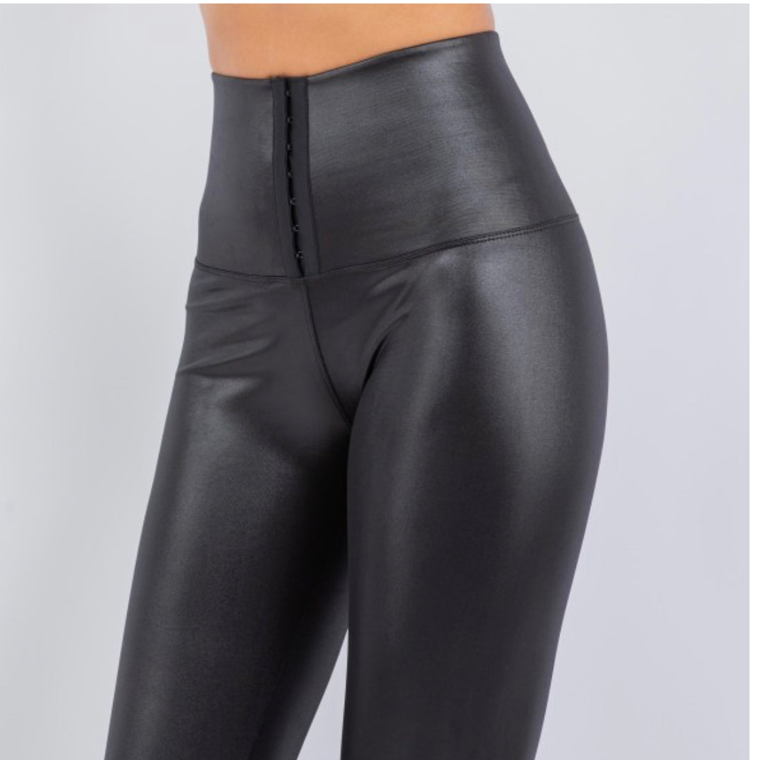 Rock your style with our Faux Leather Tummy Control Ankle Legging. The high waist design with a 5.5" corset closure provides a slimming fit that won't compromise on comfort. 95% Polyester/5% Spandex blend material provides stretch and flexibility, allowing you to move freely. For best results, wash before use as color may bleed until then.