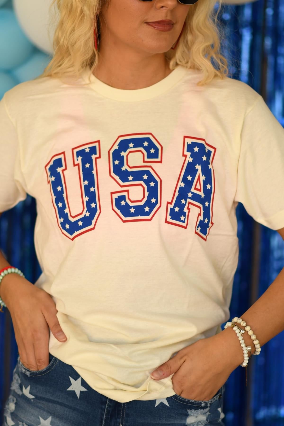 Embrace American pride with our USA Stars tee! Featuring a classic ivory color and patriotic stars design, this tee is perfect for any party or event celebrating our nation's independence. Show off your love for the USA in style with this must-have shirt.